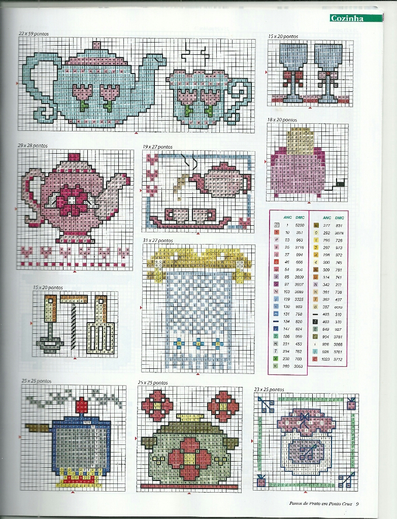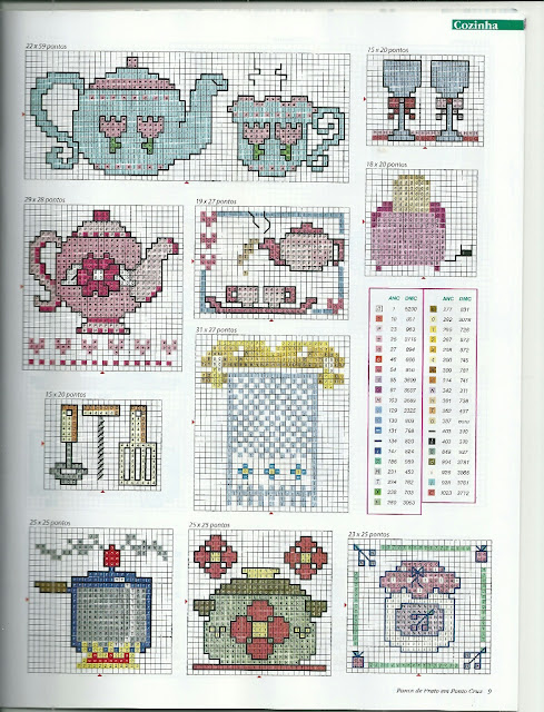 Hoje começaremos a semana com a "Cozinha: Utensílios Charmosos em Ponto Cruz". São nove gráficos lindos para bordar e decorar panos de prato, toalhas de mesa e kits completos para a cozinha. Os gráficos estão recheados de bules e xícaras decoradas, talheres, panelas e um monograma para bordar semaninhas. Tudo dependerá da criatividade da bordadeira!