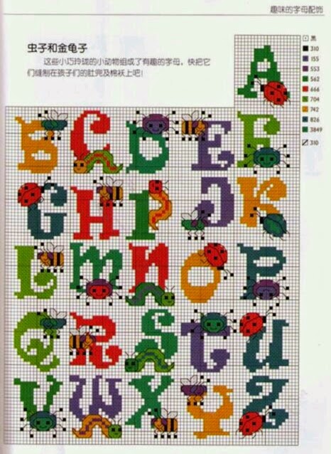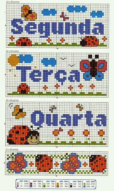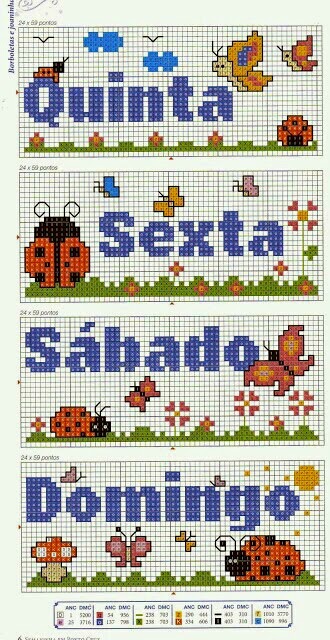 Hoje começaremos a semana com o "Alfabeto e Semaninha das Joaninhas em Ponto Cruz". São dois graciosos monogramas e uma semaninha para bordar e enfeitar a cozinha, roupas e acessórios.
