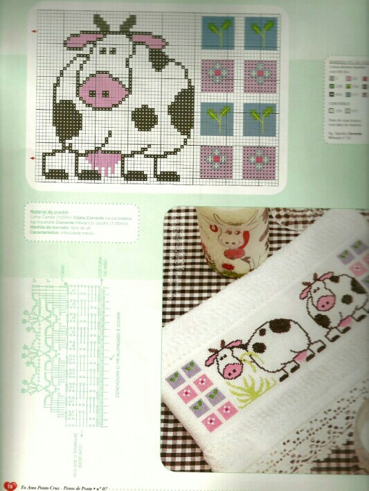 Hoje começaremos a semana com "Ponto Cruz: Galinha e Vaquinha em Panos de Prato". São dois gráficos com monogramas super fofos para alegrar e decorar nossa cozinha. Com estes desenhos podemos bordar semaninhas também, como mostra na 4° foto.
